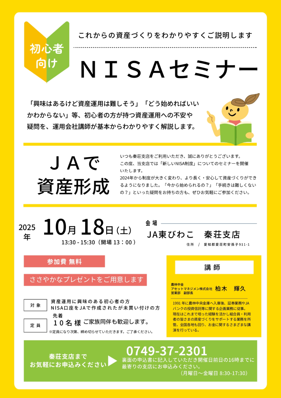 【彦根中央支店・彦根南支店・秦荘支店管内にお住まいの方限定】初心者向けNISAセミナーを開催します。