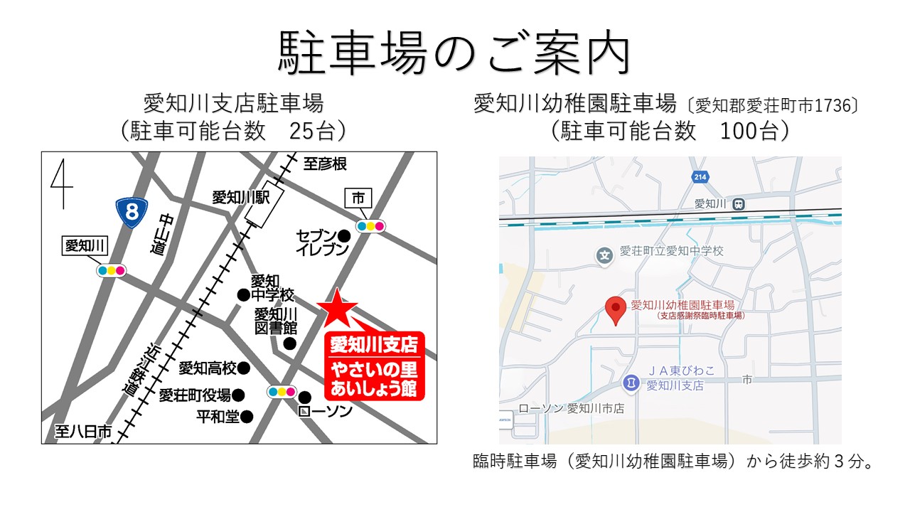 ・J A東びわこ愛知川支店(あいしょう館)、駐車可能台数25台は駐車スペースが少ない為、大変な混雑が予想されます。愛知川幼稚園駐車場(臨時駐車場)をご利用ください。