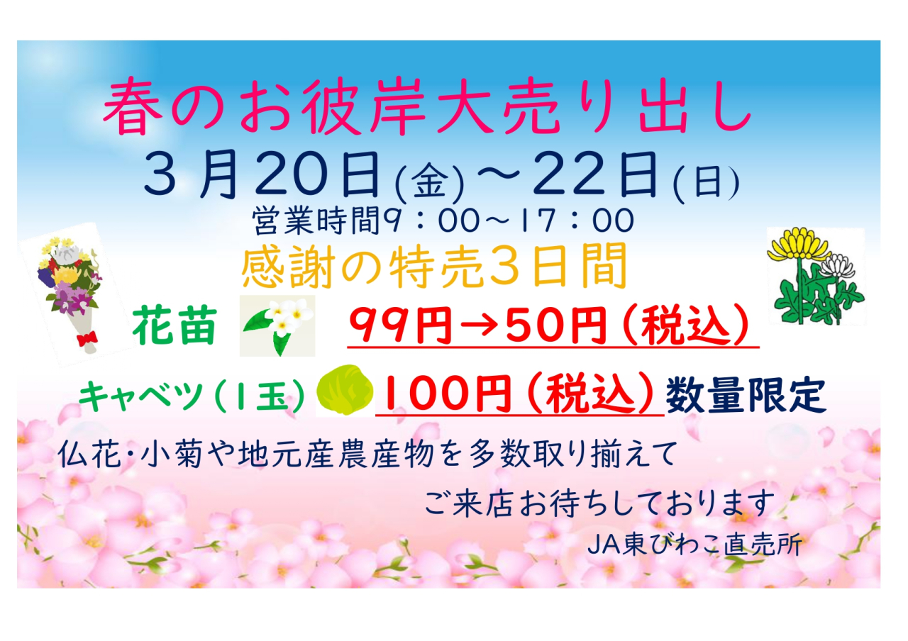 JA東びわこ農産物直売所イベント「春のお彼岸大売り出し」についてご案内いたします。