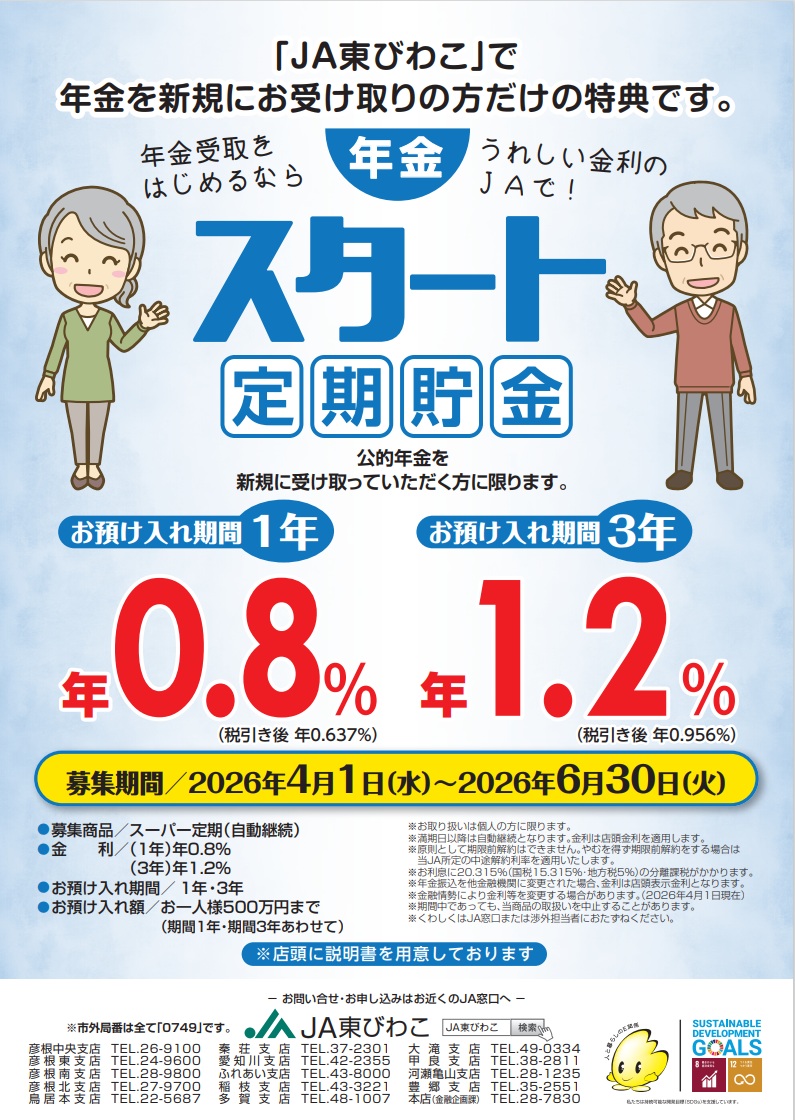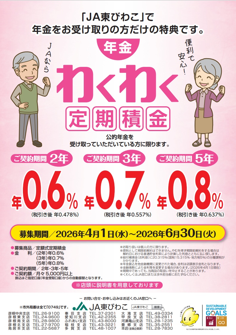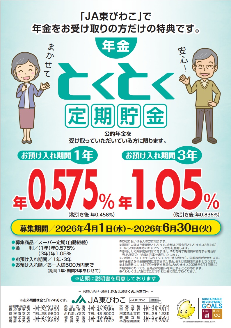 年金のことならJA東びわこへご相談ください。JAで年金口座をご指定いただければ、うれしい特典をたくさんご用意しております。「年金はこれから・・・」という方にも、年金受け取りをJA東びわこでご予約いただくとプレゼントを差し上げます。年金請求書をJAにお持ちいただければ面倒な手続きをお手伝いします。