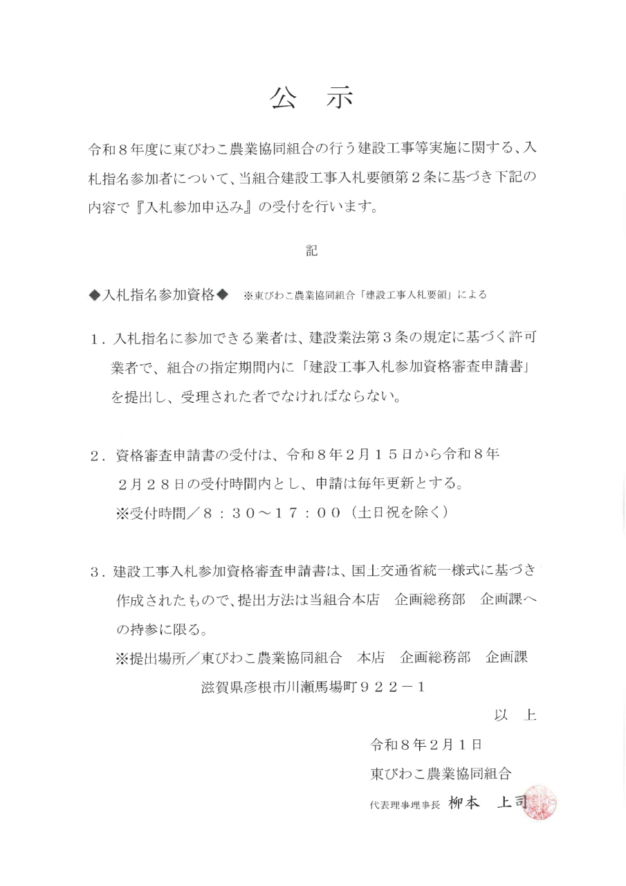 令和8年度に東びわこ農業協同組合の行う建設工事等実施に関する、入札指名参加者について、当組合建設工事入札要領第2条に基づき下記の内容で『入札参加申込み』の受付を行います。